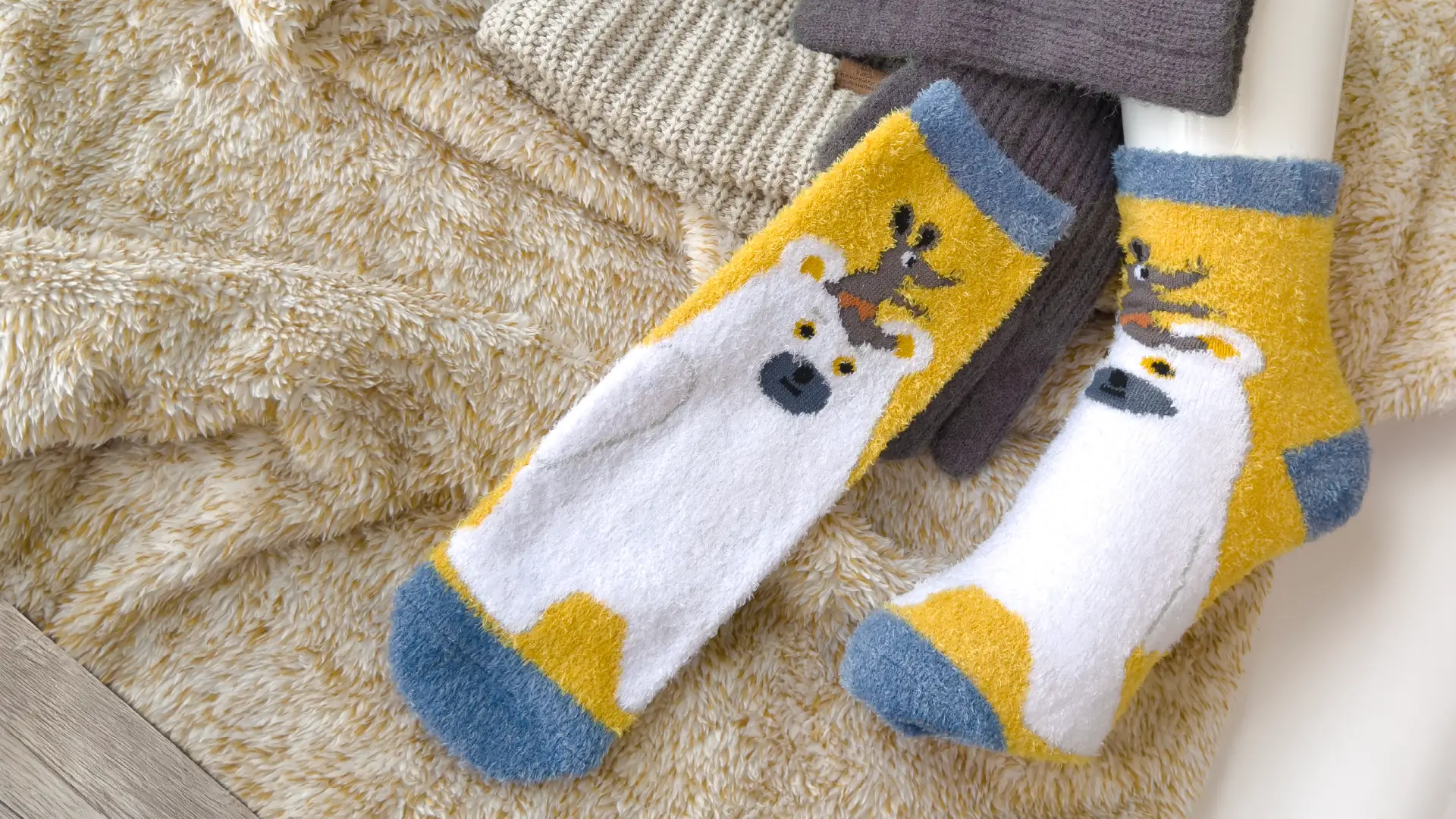 ふわふわ素材で、しろくまさんとねずみくんが仲良く描かれたルームソックス。おうち時間にそっと寄り添ってくれる、リラックス感のあるアイテムです。