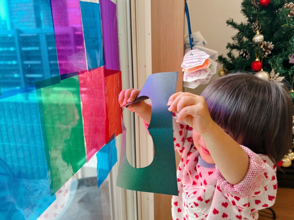 窓に貼った(静電気でくっつくのでテープ要らず)カラーセロファンも