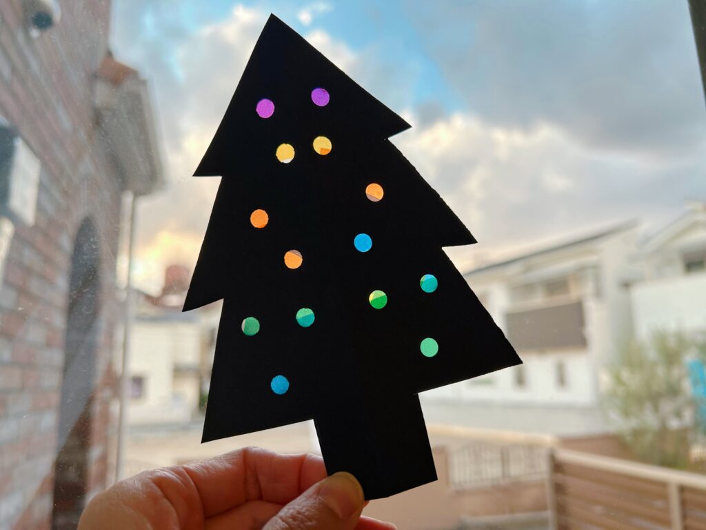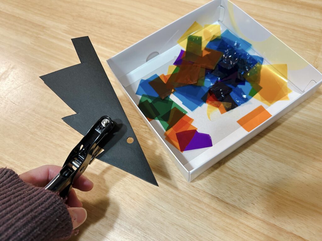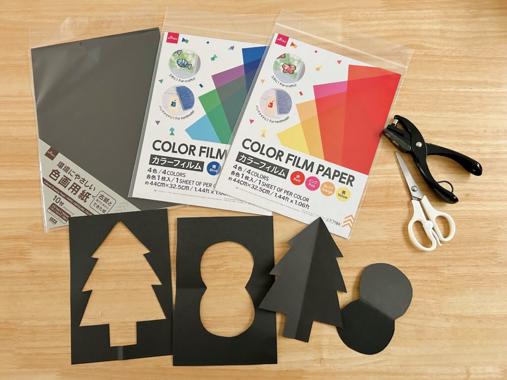 使う材料は、黒い画用紙・カラーセロファン・透明テープ・穴あけパンチ・のりです。