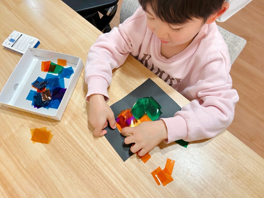 切り抜きやセロファンなどの素材で、まずは遊びました!
