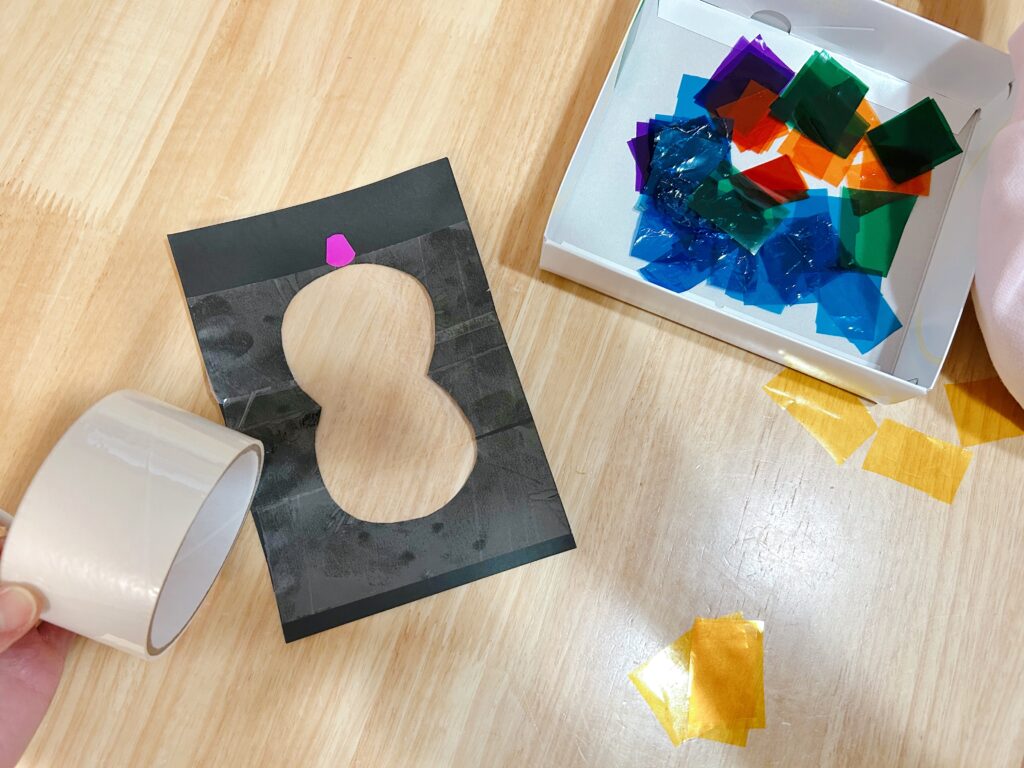 2.穴の部分にスティックのりでカラーセロファンを貼る