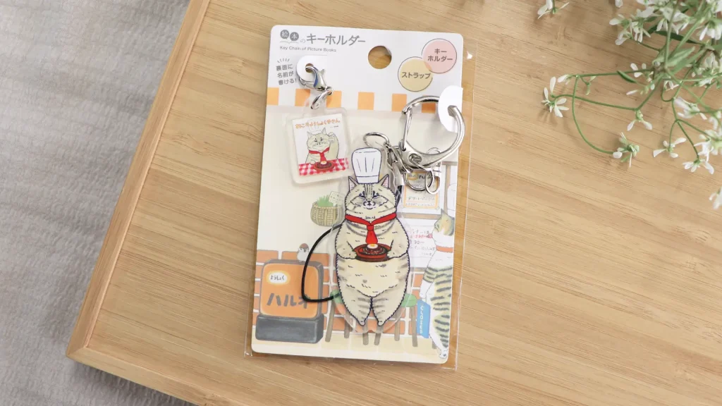 大人気の『ねこのようしょくやさん』から、おいしそうなハンバーグを持ったねこさんのキーホルダー。