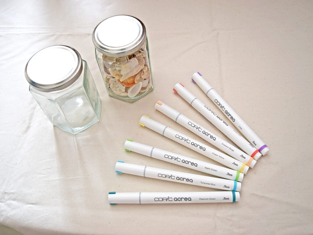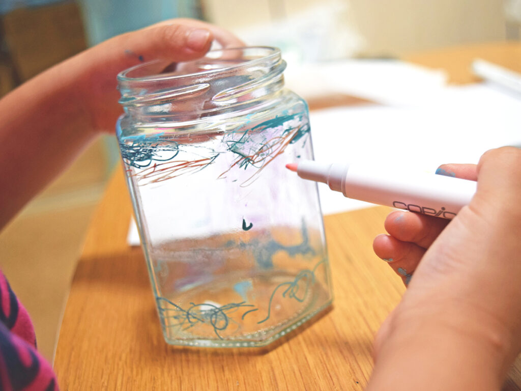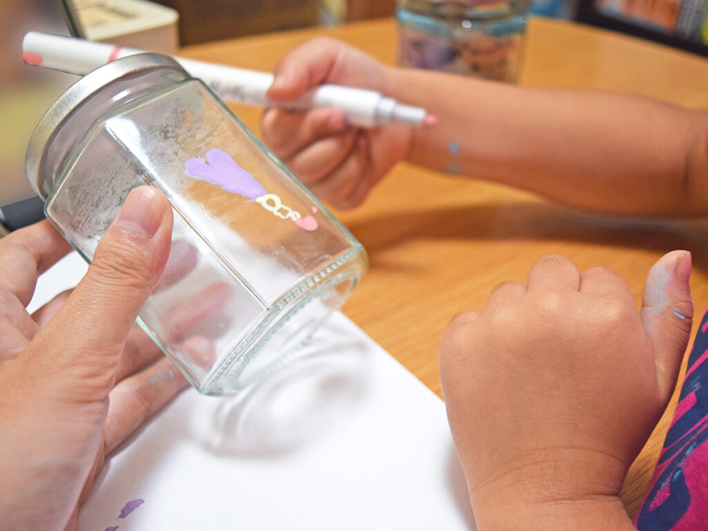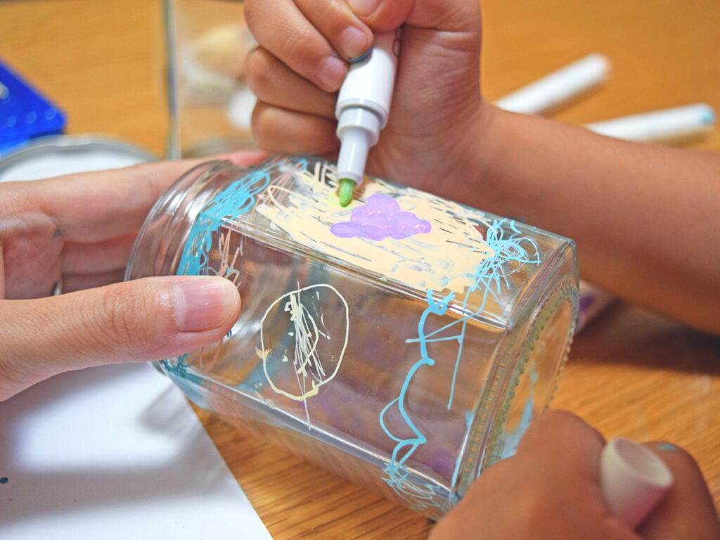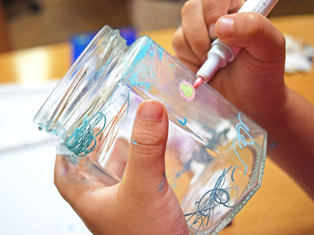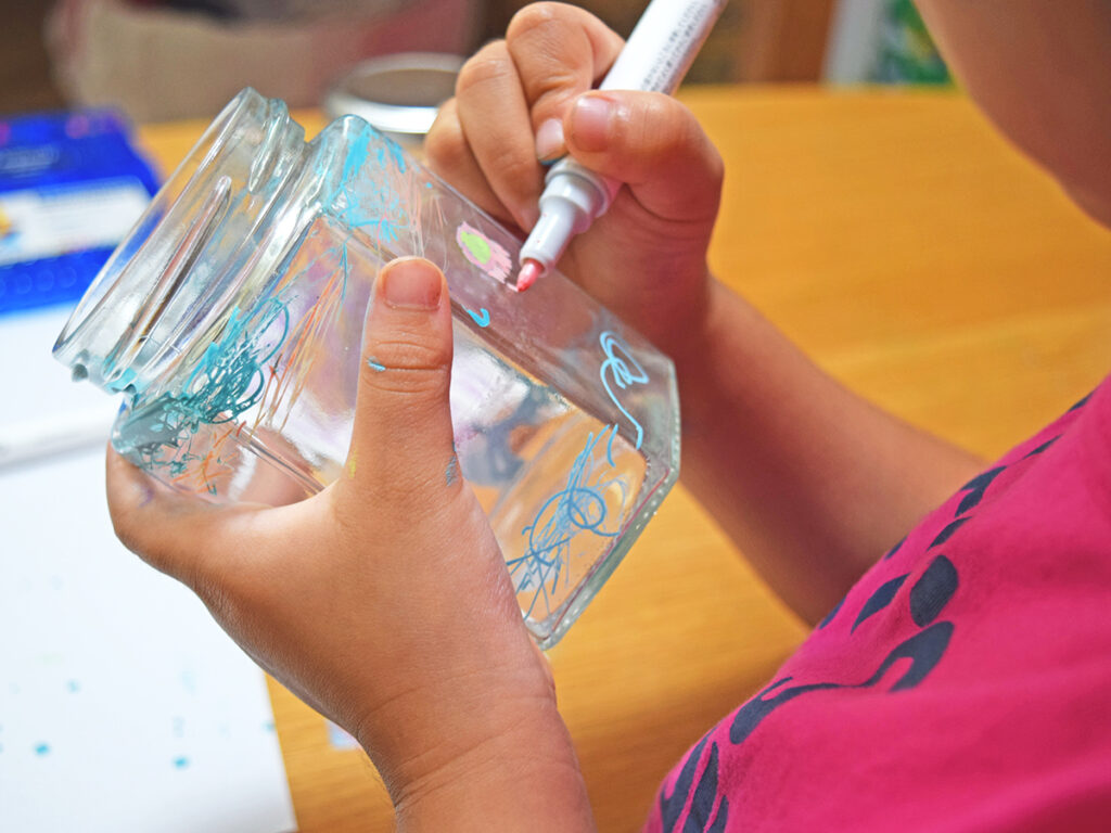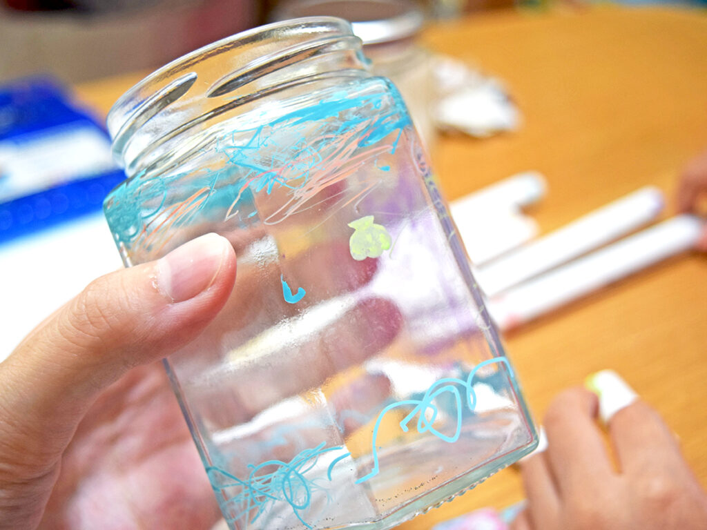 この工作は、ガラス瓶と水性顔料マーカーがあれば、簡単に始められます。