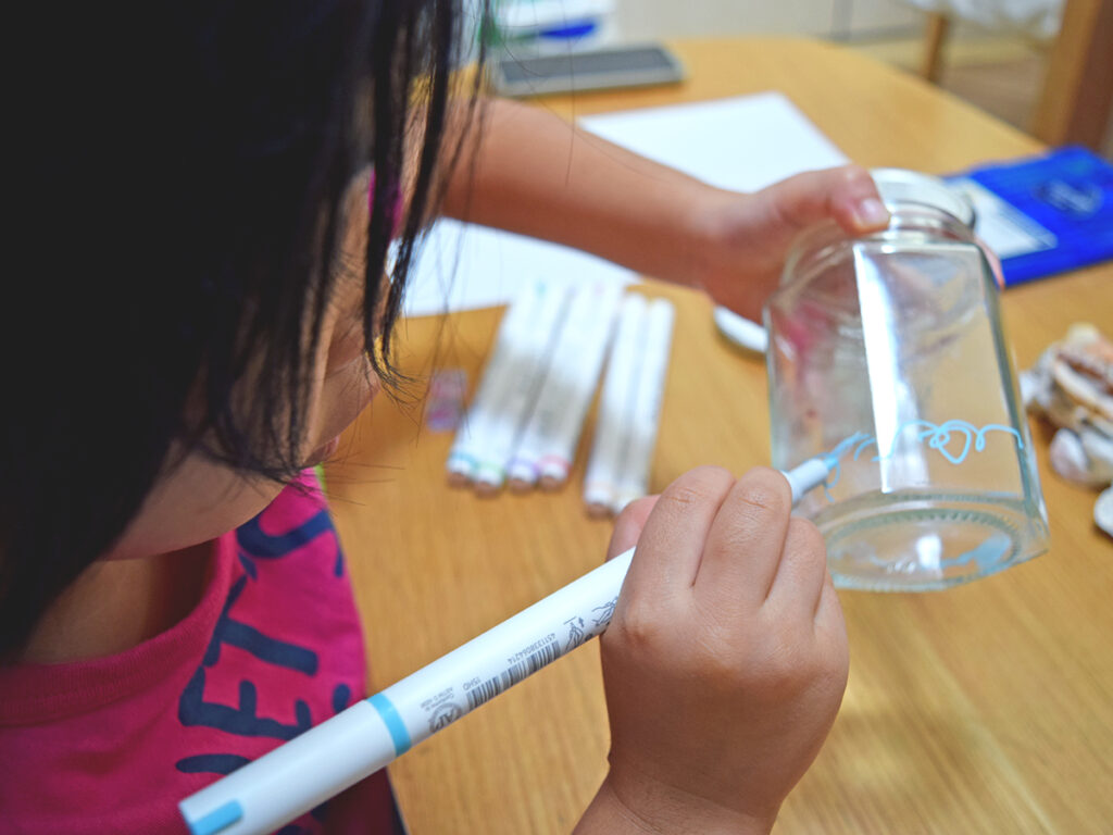 「今日はガラス瓶に絵を描くよ」と娘に伝えると、「えっ!紙じゃなくてガラスに描いていいの?」と目を輝かせていました。