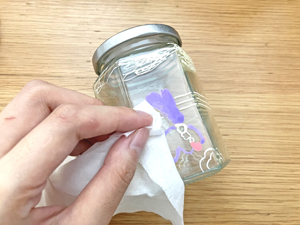細部を塗る時は、ママパパがガラス瓶を持って固定すると、お子さんが作業しやすくなりますよ。