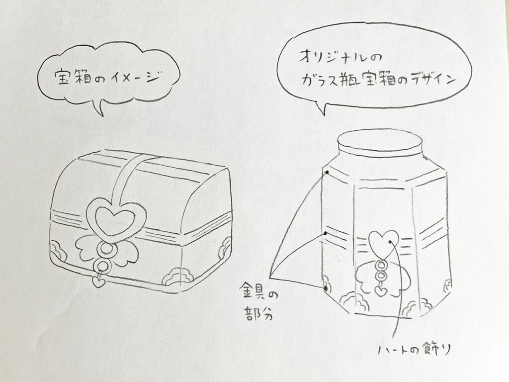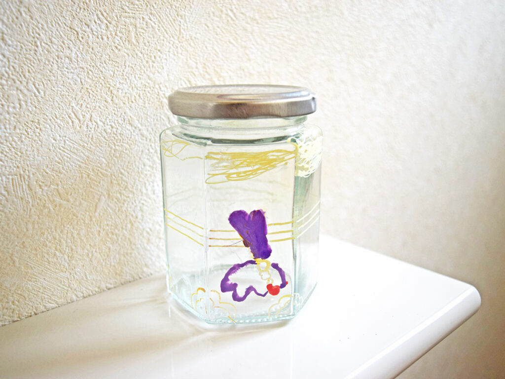 工作が出来上がると、「もっと作りたい!」と娘からリクエストが。そこで、「好きなようにデザインするのはどうかな?」と話し合い、ガラス瓶でオリジナルの宝箱も制作することにしました。