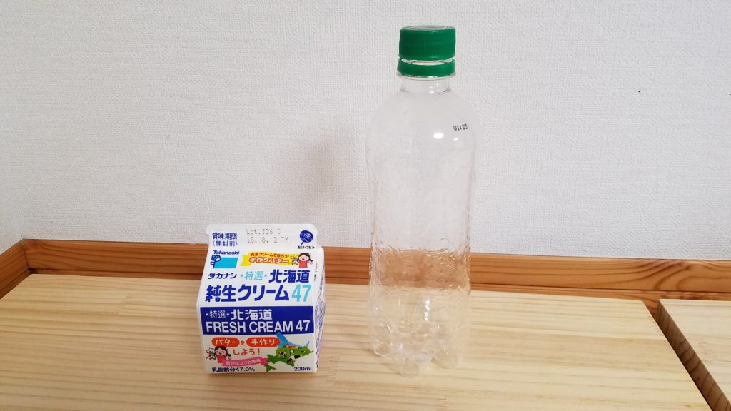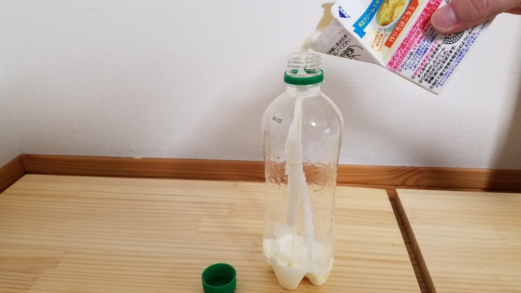 - ペットボトルに生クリームを入れてフタをしっかりしめる。