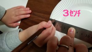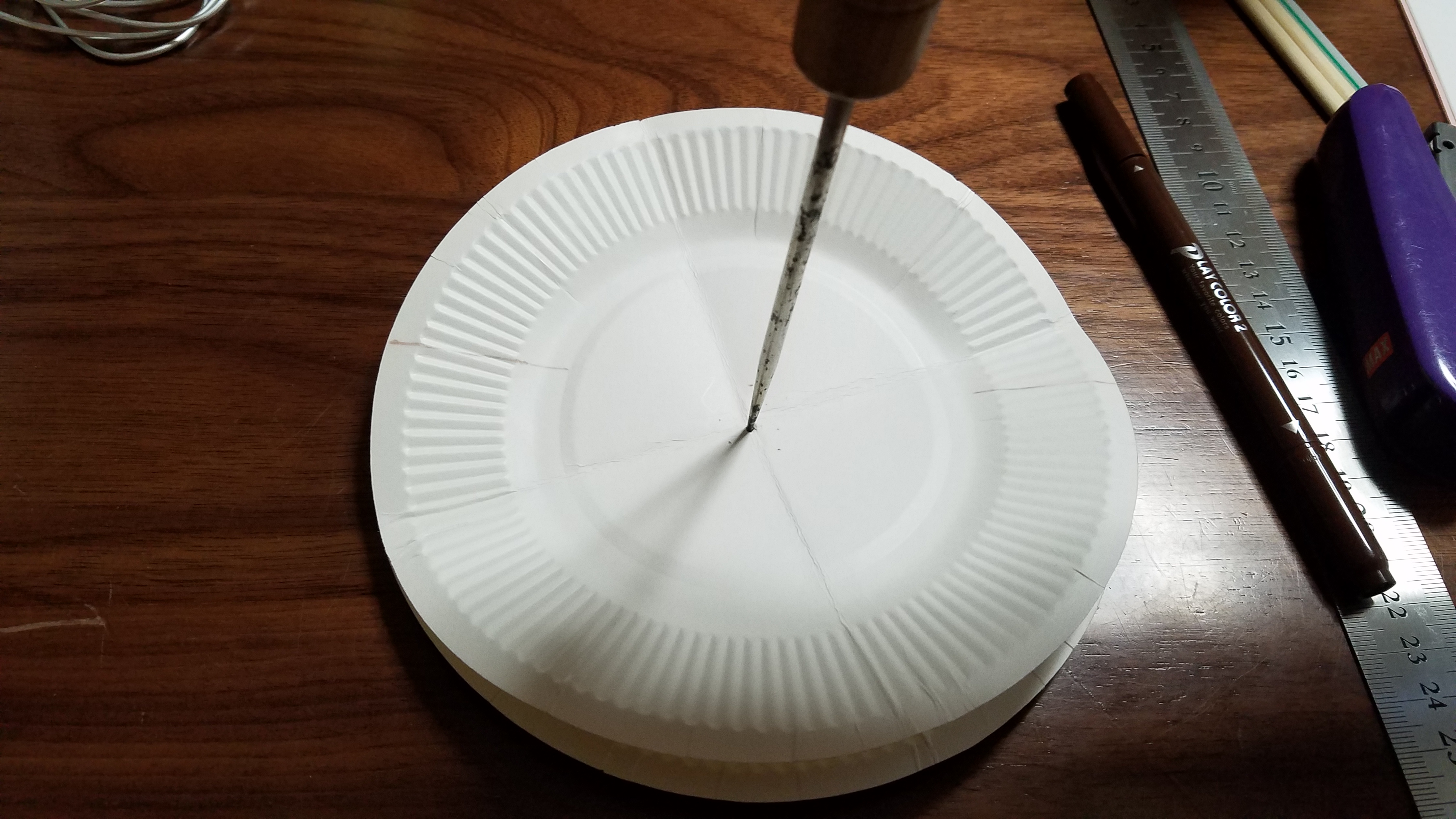 1-2 もう1枚の紙ざらを重ねキリや針で穴をあける。