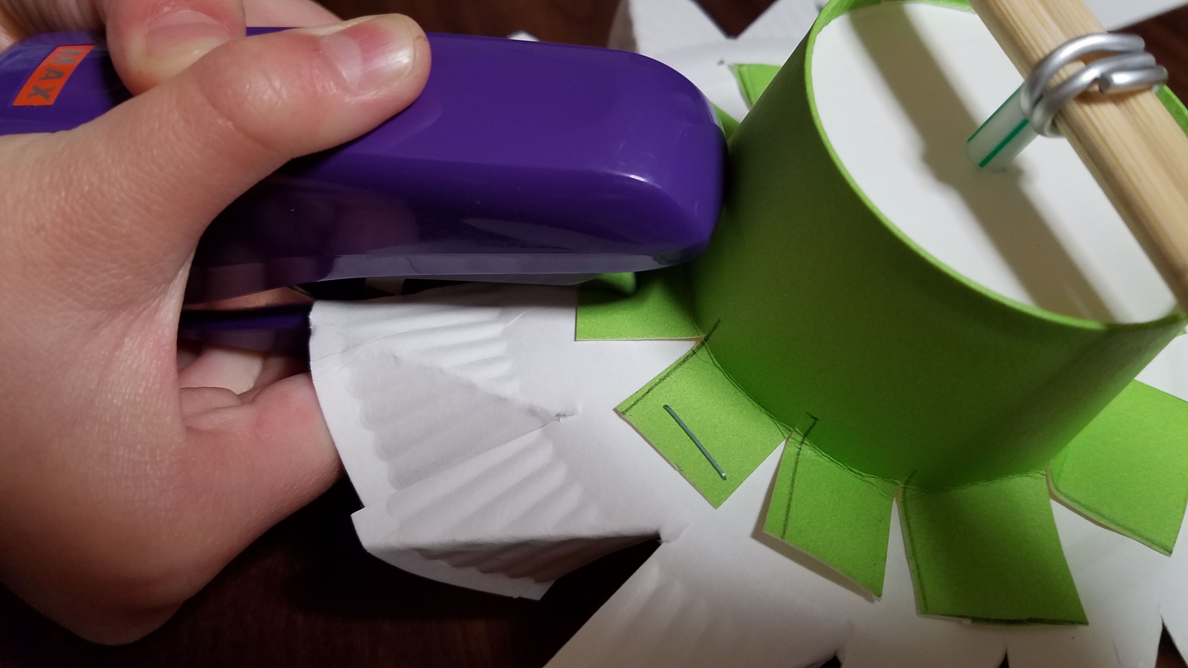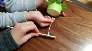 ⒊はりがねをわりばしの間に固定し、ストロー ➡ カップ ➡ 紙ざらの順にさしていき、はりがねの先をまげる。