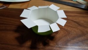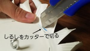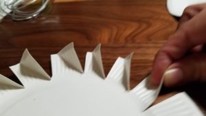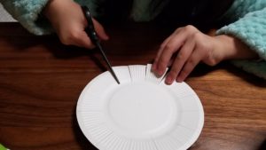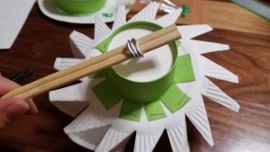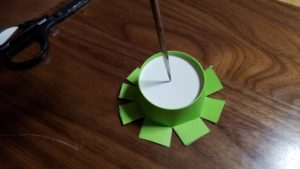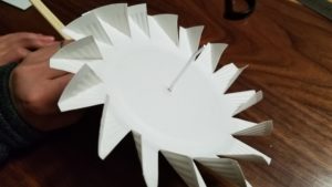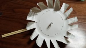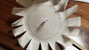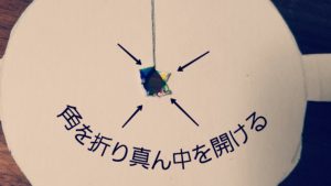 ⒍紙ざらから出ているはりがねに回転盤の切り込みを通して、紙ざらの切り込みに回転盤をさして出来上がり。